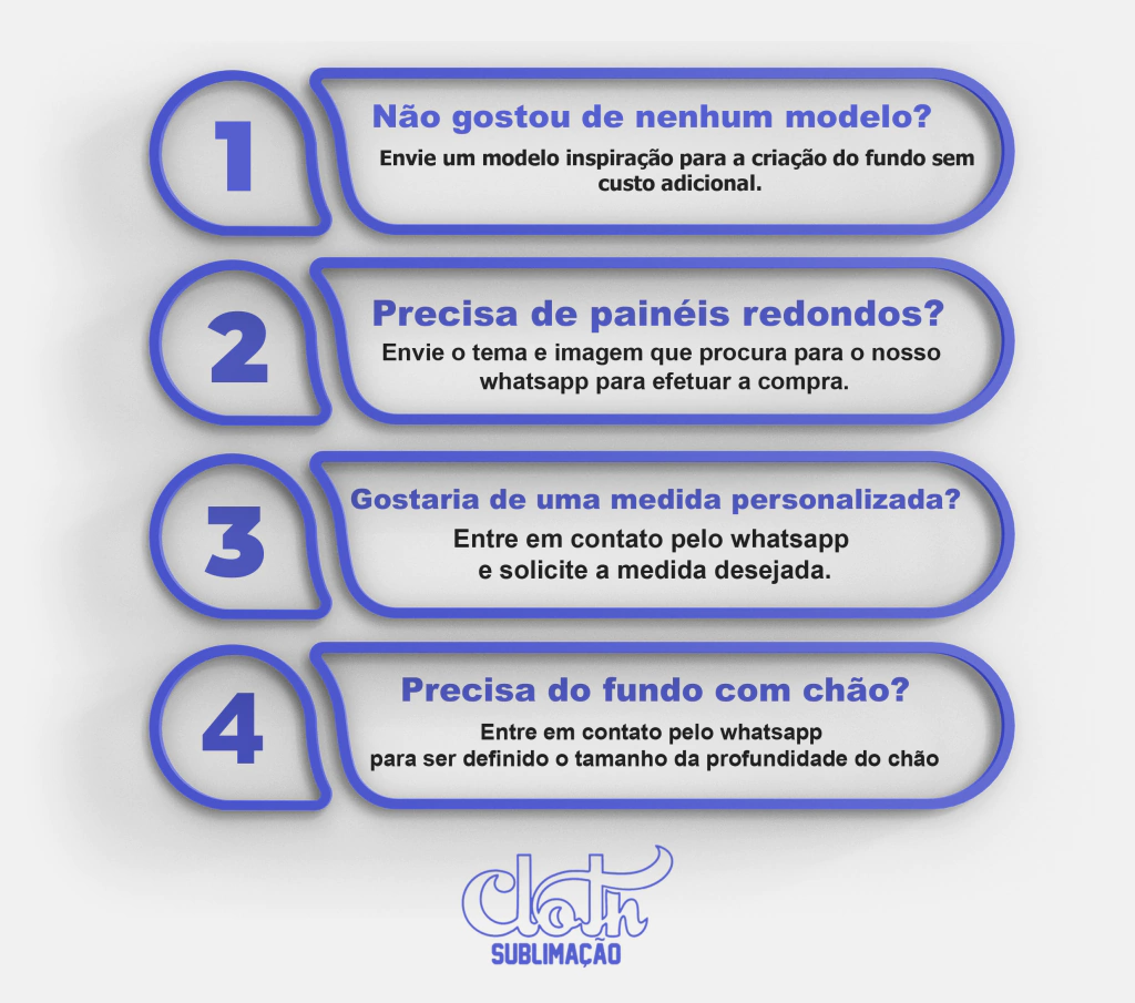 Emenda: todos os fundos com as duas dimensões maiores que 1,50 terão uma emenda discreta na posição que melhor se adequar a imagem escolhida. Caso queira escolher o local adequado da emenda entre em contato pelo whatsapp antes de efetuar a compra para realizar uma simulação, caso contrário, a emenda será feita no local adequado de acordo com a produção. Caso não haja observação sobre a emenda antes de confecção do fundo, a empresa não irá arcar com trocas motivadas pela posição da emenda.